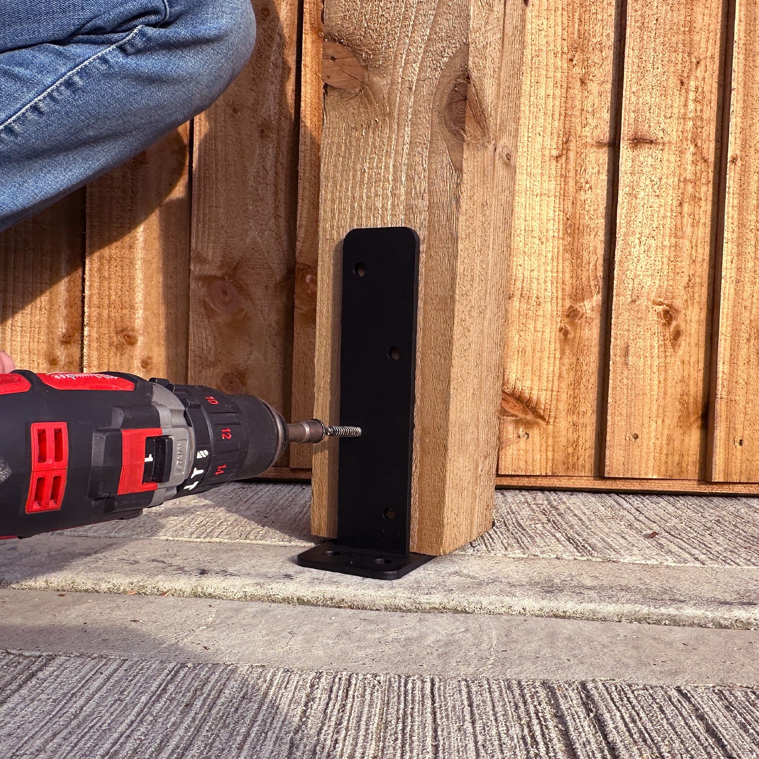 This bolt-down U-shaped post support bracket secures 4-inch (100mm) wooden posts to concrete or hard ground. It's perfect for fences, pergolas, and other outdoor structures, providing a strong foundation without needing to dig or pour concrete. The base plate bolts into the ground using 4 bolt holes, while the tall U-shaped top section firmly holds the wood in place with 8 staggered screw holes for extra strength.